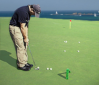 Practice lag putts from just beyond what you feel is your automatic two-putt range. Focus on swinging the putter to even lengths back and through, with the same steady pace throughout the stroke. Feel the length of stroke you need by swinging the putter over the ball as you're looking at the hole, your eyes over the target line (left). Get a feel for speed before worrying about the break.